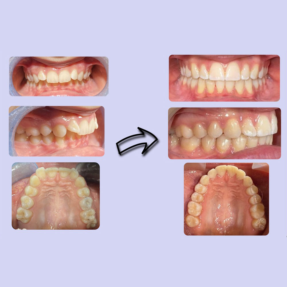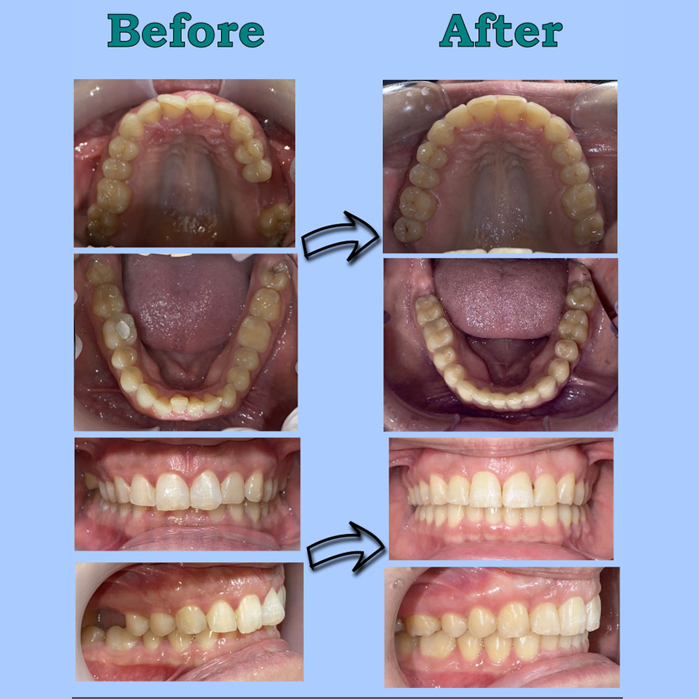Before and after orthodontic treatment demonstrating the correction of crowding, bite alignment, and overall smile aesthetics.